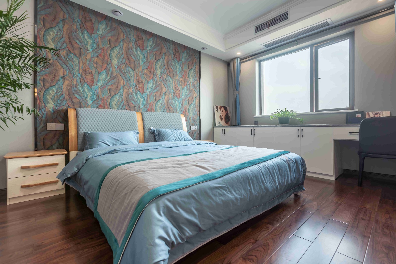 在原戶型的基礎上,并沒有做太多的改動??看霸黾恿艘慌哦ㄖ乒褡?,既能做梳妝臺又能放置東西。最引人注目的是床頭背景墻,充滿了藝術氣息,深邃幽遠。